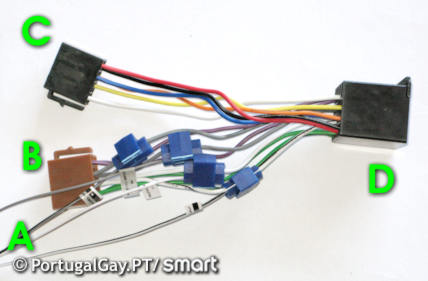 Fora do Carro:Em primeiro lugar comprar uma extensão ISO-ISO directa (por exemplo "Brindauto - Fichas Auto Rádio Nº1 (Fiat, Opel, Seat)") e ligadores rápidos. Depois ligar cada uma das entradas do amplificador aos cabos respectivos na extensão. Na figura pode-se ver a extensão ISO já com as ligações feitas (A-ligação ao amplificador; B-ligação som autorádio; C-ligação alimentação autorádio; D-ligação cablagem do carro).