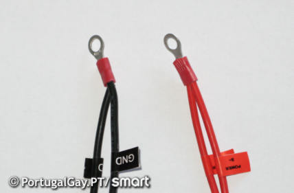 Para as ligações de alimentação basta utilizar ligações como as da imagem seguinte com um diâmetro ideal do furo entre 5 a 6mm. Se não estiver incluído não esquecer um fusível de protecção no cabo de alimentação positivo perto (10 a 30cm) da ligação à bateria.