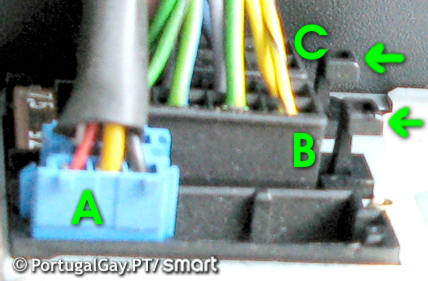 Dentro do Carro - Autorádio:1. remover o autorádio e localizar as fichas B e C da figura (a ficha A pode estar ou não presente e é utilizada para entrada MP3/Aux do autorádio).