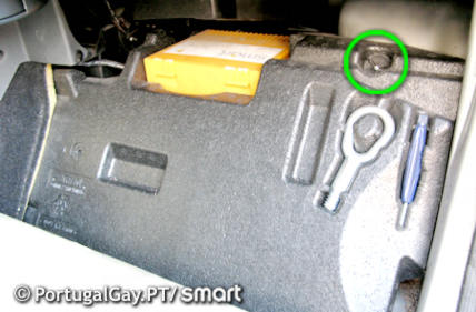 Dentro do Carro - Bateria:1. levantar a parte da frente da alcatifa do lado do passageiro.