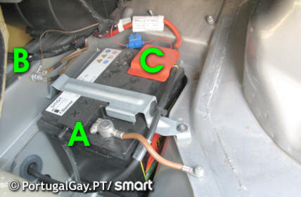 6. ligar a alimentação +12V directamente à bateria no ponto C (a tampa vermelha é facilmente removível puxando-a para cima).