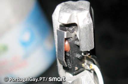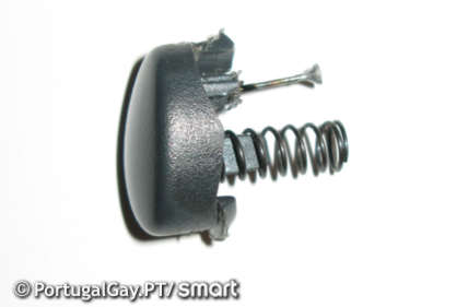 Nesta altura o diagnóstico é que o botão plástico no manípulo partiu-se... se olhar para dentro do manípulo deveria aparecer cerca de 1mm do botão mesmo sem este estar premido, e é isso que vamos resolver de seguida.