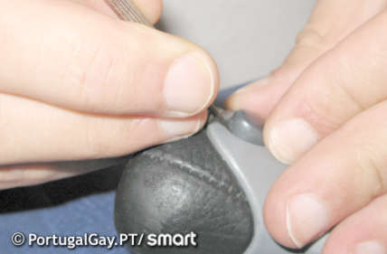 3. Remova o botão do manípulo. Use uma chave pequena para o efeito, há dois encaixes no botão (ver imagens seguintes).
